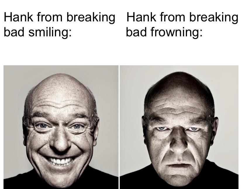 Dean norris' reaction meme format showing him smiling and then.